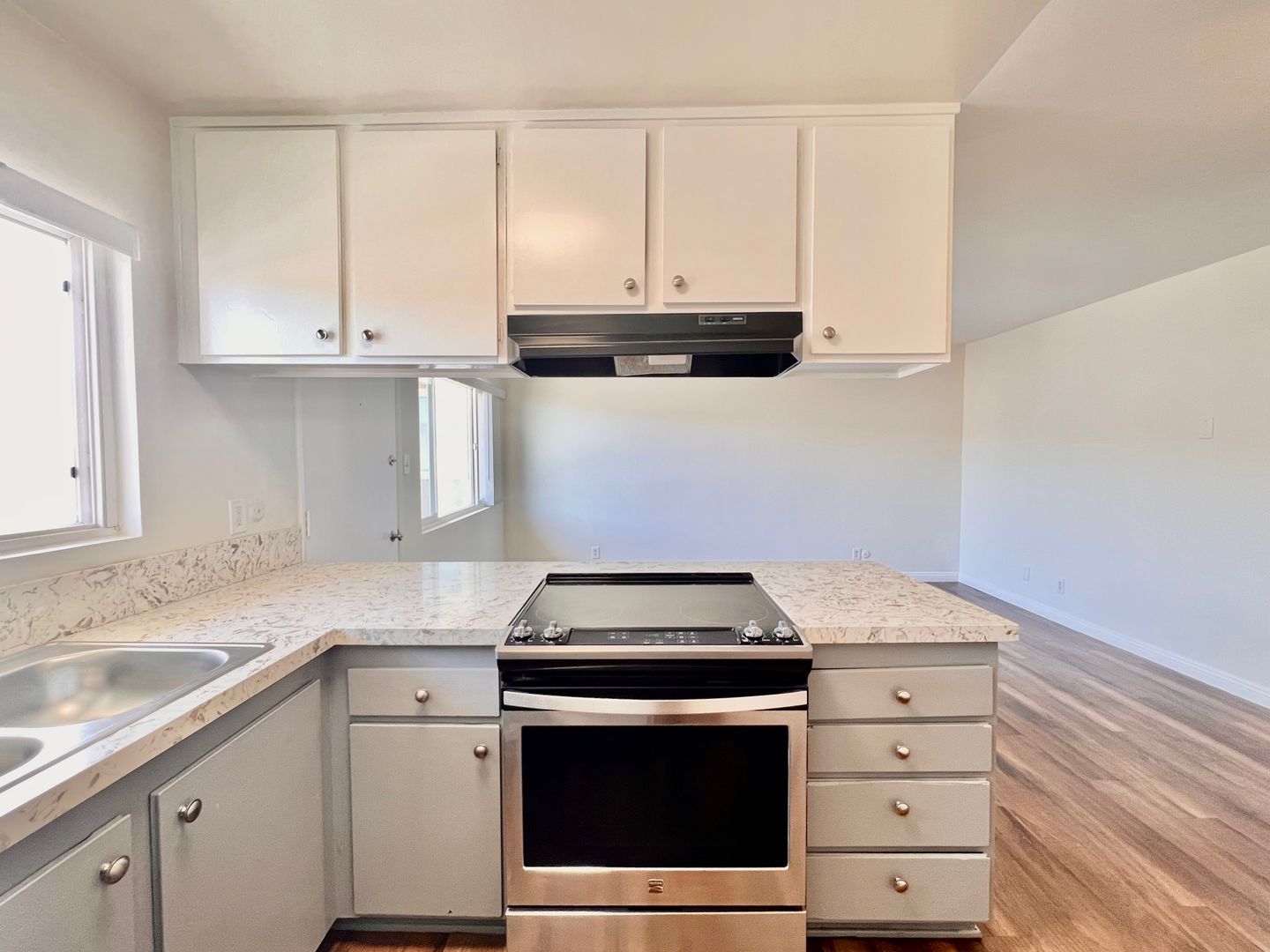 Inside, you'll enjoy ample cabinetry, sparkling quartz countertops, gleaming hardwood floors, and a stainless steel electric stove (which means no gas bill!). The unit also boasts freshly painted walls, spacious closets, and one covered parking space for convenience.